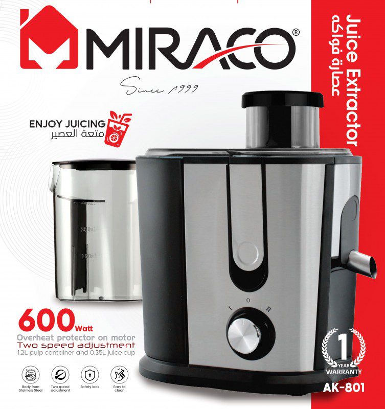 عصارة ميراكو AK-801 هي عصارة فواكه بقوة 600 واط، تتميز بفتحة واسعة بقطر 65 مم تسمح بإدخال تفاحة كاملة، ووعاء وفلتر وغلاف من الستانلس ستيل المقاوم للصدأ، وميزة سرعتين لتناسب الفواكه الطرية والصلبة، بالإضافة إلى حماية من الحرارة الزائدة للمحرك.
